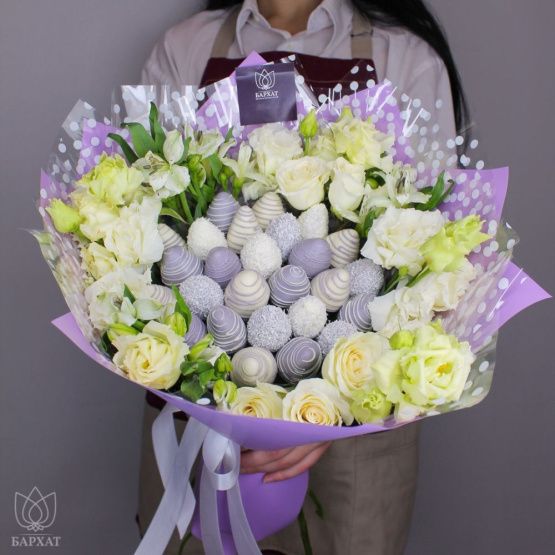 Мы собираем клубничные букеты по весу, а не по штукам. Количество, форма и размер ягод могут отличаться — ведь каждая ягода уникальна.