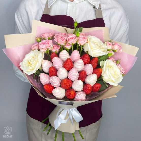 Мы собираем клубничные букеты по весу, а не по штукам. Количество, форма и размер ягод могут отличаться — ведь каждая ягода уникальна.