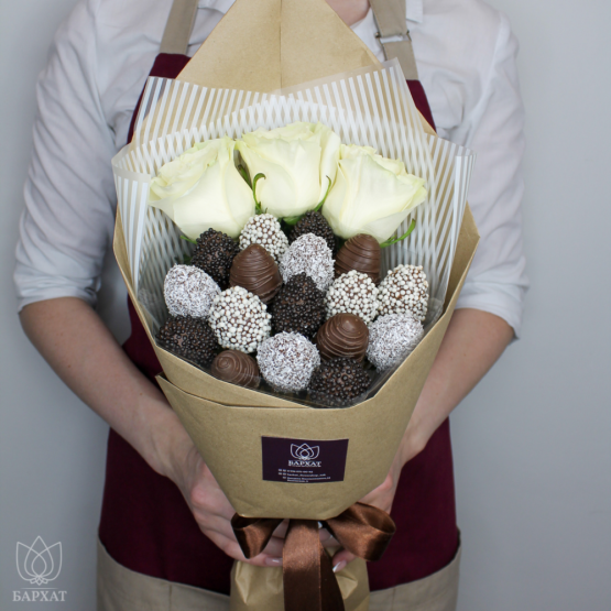 Мы собираем клубничные букеты по весу, а не по штукам. Количество, форма и размер ягод могут отличаться — ведь каждая ягода уникальна.