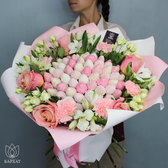 Мы собираем клубничные букеты по весу, а не по штукам. Количество, форма и размер ягод могут отличаться — ведь каждая ягода уникальна.