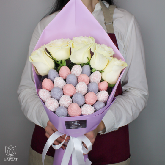 Мы собираем клубничные букеты по весу, а не по штукам. Количество, форма и размер ягод могут отличаться — ведь каждая ягода уникальна.