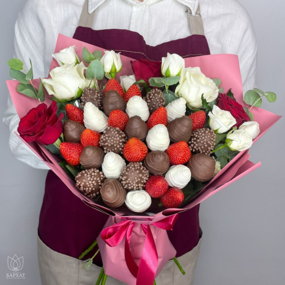 Мы собираем клубничные букеты по весу, а не по штукам. Количество, форма и размер ягод могут отличаться — ведь каждая ягода уникальна.