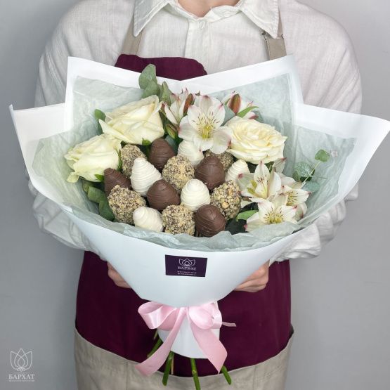 Мы собираем клубничные букеты по весу, а не по штукам. Количество, форма и размер ягод могут отличаться — ведь каждая ягода уникальна.