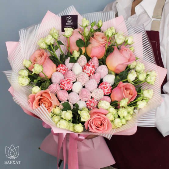 Мы собираем клубничные букеты по весу, а не по штукам. Количество, форма и размер ягод могут отличаться — ведь каждая ягода уникальна.