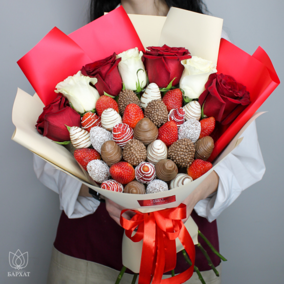 Мы собираем клубничные букеты по весу, а не по штукам. Количество, форма и размер ягод могут отличаться — ведь каждая ягода уникальна.