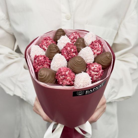 Мы собираем клубничные букеты по весу, а не по штукам. Количество, форма и размер ягод могут отличаться — ведь каждая ягода уникальна.