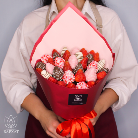 Мы собираем клубничные букеты по весу, а не по штукам. Количество, форма и размер ягод могут отличаться — ведь каждая ягода уникальна.