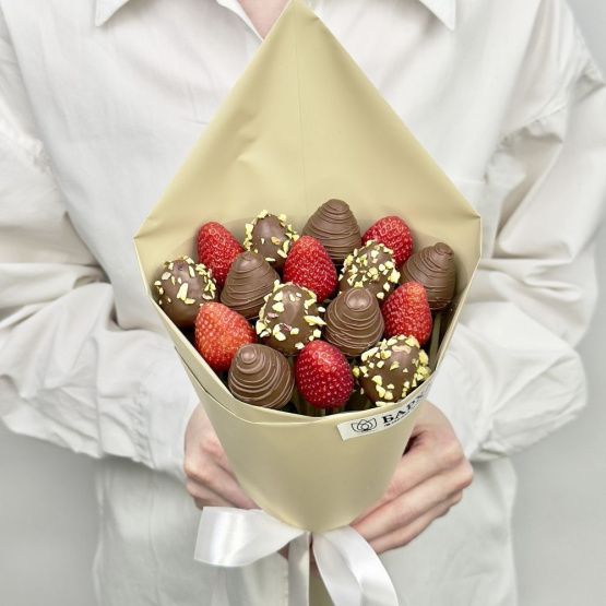 Мы собираем клубничные букеты по весу, а не по штукам. Количество, форма и размер ягод могут отличаться — ведь каждая ягода уникальна.
