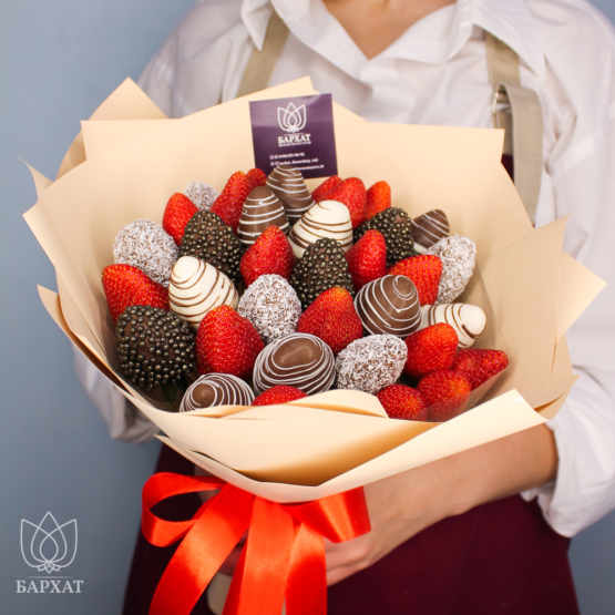 Мы собираем клубничные букеты по весу, а не по штукам. Количество, форма и размер ягод могут отличаться — ведь каждая ягода уникальна.