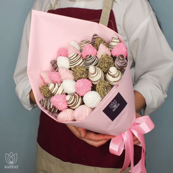 Мы собираем клубничные букеты по весу, а не по штукам. Количество, форма и размер ягод могут отличаться — ведь каждая ягода уникальна.