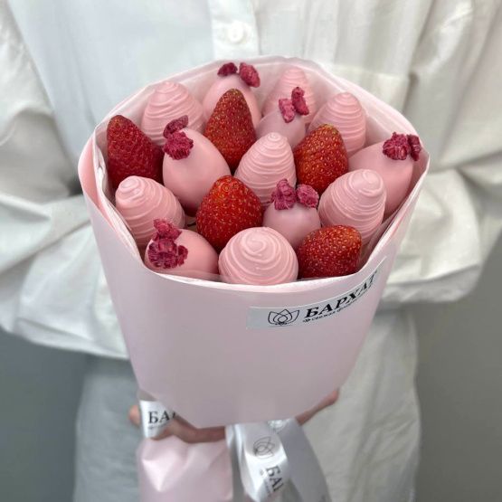 Мы собираем клубничные букеты по весу, а не по штукам. Количество, форма и размер ягод могут отличаться — ведь каждая ягода уникальна.