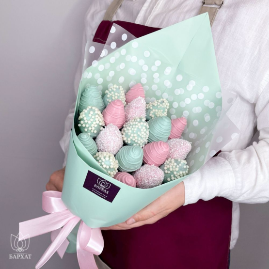 Мы собираем клубничные букеты по весу, а не по штукам. Количество, форма и размер ягод могут отличаться — ведь каждая ягода уникальна.