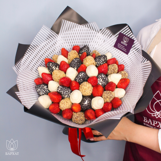 Мы собираем клубничные букеты по весу, а не по штукам. Количество, форма и размер ягод могут отличаться — ведь каждая ягода уникальна.