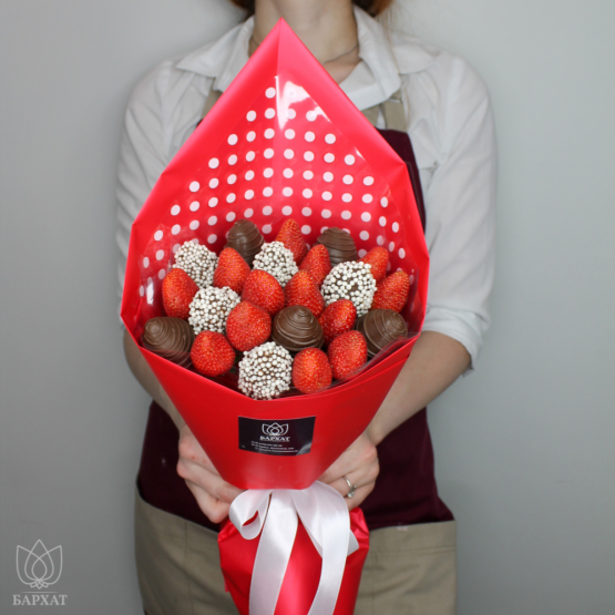 Мы собираем клубничные букеты по весу, а не по штукам. Количество, форма и размер ягод могут отличаться — ведь каждая ягода уникальна.