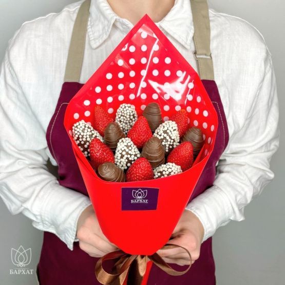 Мы собираем клубничные букеты по весу, а не по штукам. Количество, форма и размер ягод могут отличаться — ведь каждая ягода уникальна.