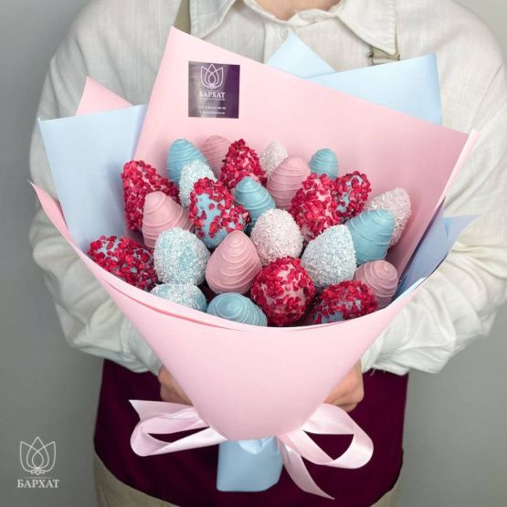 Мы собираем клубничные букеты по весу, а не по штукам. Количество, форма и размер ягод могут отличаться — ведь каждая ягода уникальна.
