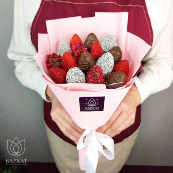 Мы собираем клубничные букеты по весу, а не по штукам. Количество, форма и размер ягод могут отличаться — ведь каждая ягода уникальна.