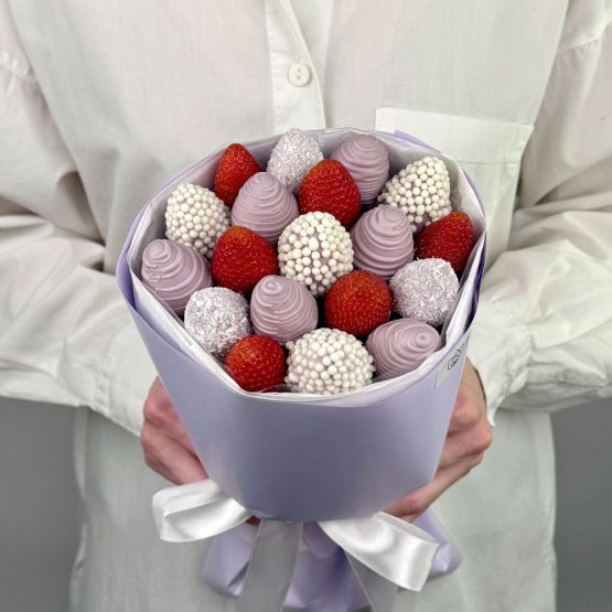 Мы собираем клубничные букеты по весу, а не по штукам. Количество, форма и размер ягод могут отличаться — ведь каждая ягода уникальна.