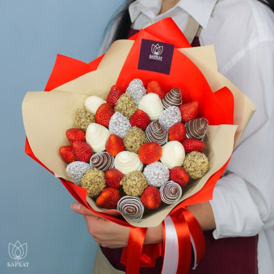 Мы собираем клубничные букеты по весу, а не по штукам. Количество, форма и размер ягод могут отличаться — ведь каждая ягода уникальна.