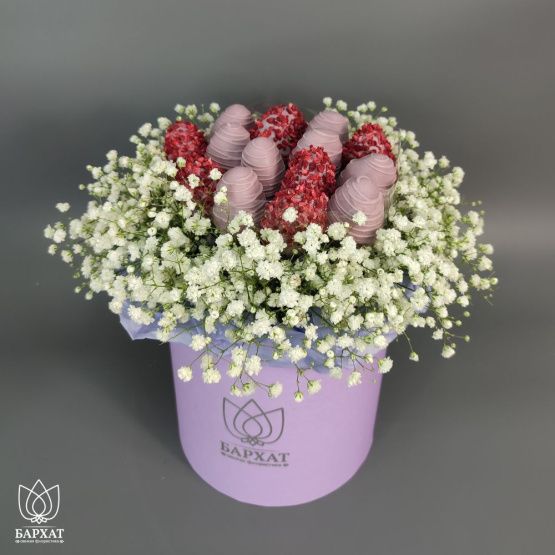 Мы собираем клубничные букеты по весу, а не по штукам. Количество, форма и размер ягод могут отличаться — ведь каждая ягода уникальна.