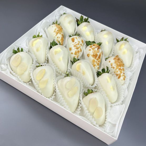 Мы собираем клубничные букеты по весу, а не по штукам. Количество, форма и размер ягод могут отличаться — ведь каждая ягода уникальна.