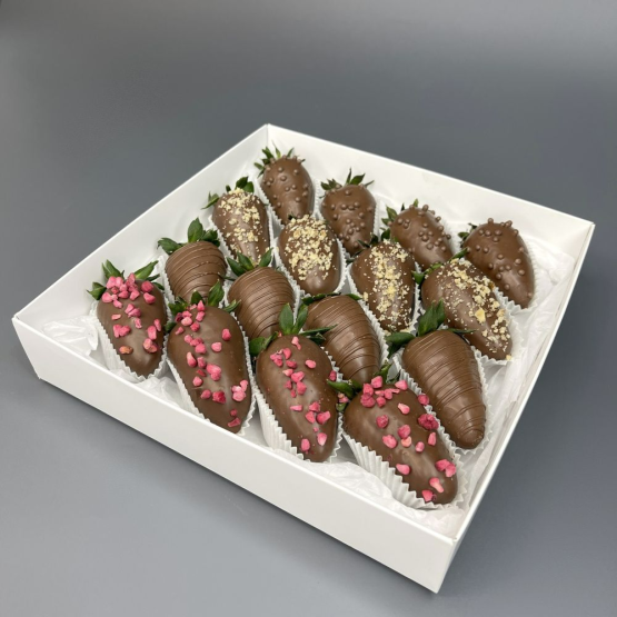 Мы собираем клубничные букеты по весу, а не по штукам. Количество, форма и размер ягод могут отличаться — ведь каждая ягода уникальна.