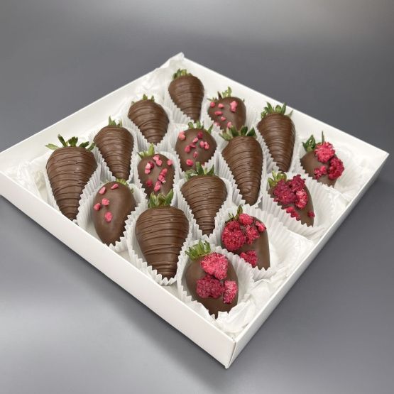Мы собираем клубничные букеты по весу, а не по штукам. Количество, форма и размер ягод могут отличаться — ведь каждая ягода уникальна.