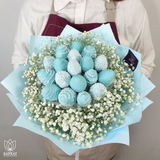 Мы собираем клубничные букеты по весу, а не по штукам. Количество, форма и размер ягод могут отличаться — ведь каждая ягода уникальна.
