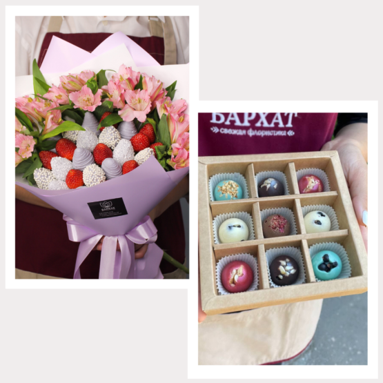 Мы собираем клубничные букеты по весу, а не по штукам. Количество, форма и размер ягод могут отличаться — ведь каждая ягода уникальна.