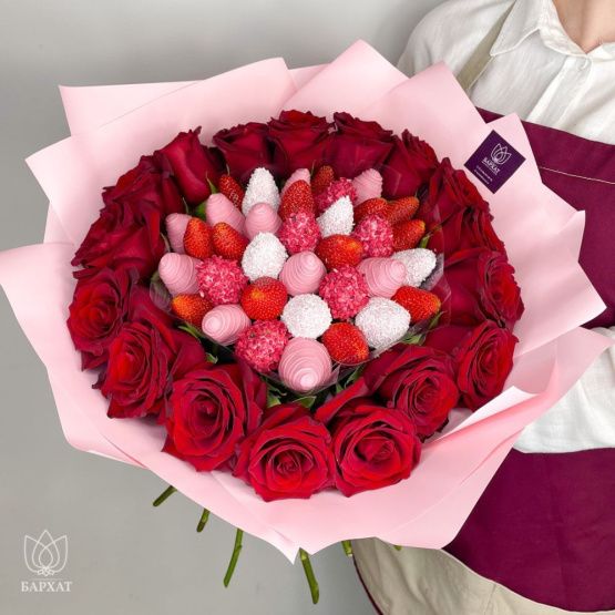 Мы собираем клубничные букеты по весу, а не по штукам. Количество, форма и размер ягод могут отличаться — ведь каждая ягода уникальна.